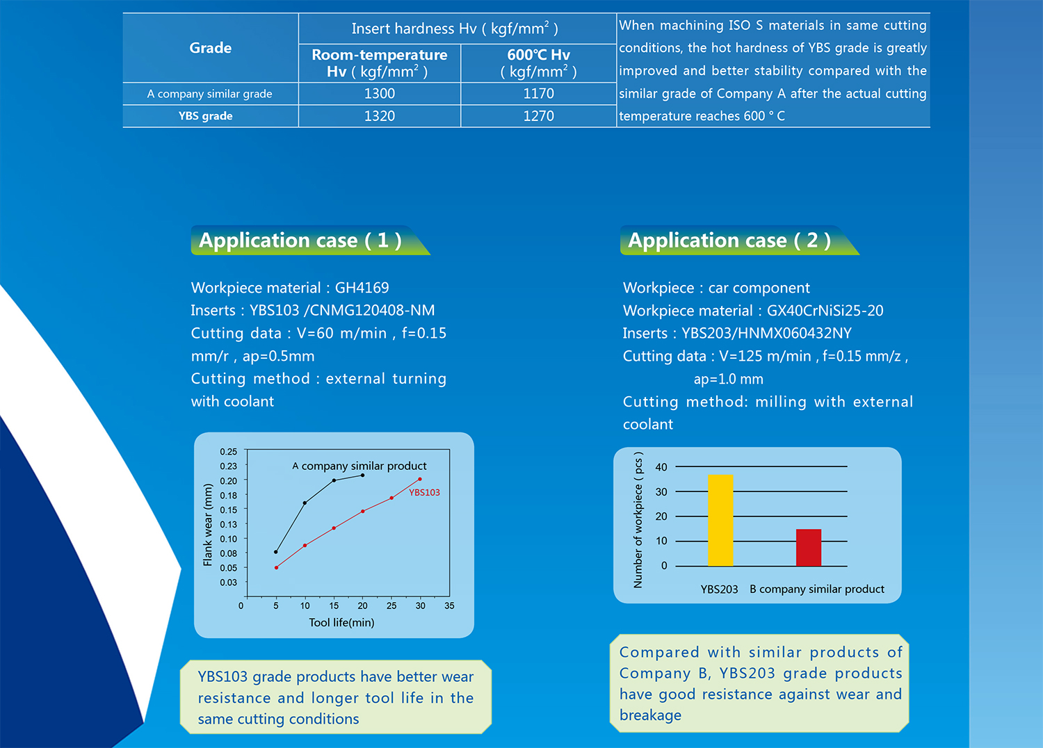 - The YBS series offer the perfect solutions for difficult-to-cut materials, especially in HRSA(Heat resistant super alloy) materials such as nickel-based alloy and titanium alloy.