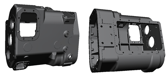 Transmission Cases are often not in a regular shape with multiple partsfor machining, and the machining techniques are so complex that variousmachining operations needed to complete the machining. Double intermediate shafttransmission case is a typical grey cast iron part with thin-walled. Its mainbody includes main tank and vice tank. There are three center holes in thefloor. The vice tank is opening on one side, with 5 through holes on it withthe size of 510mm * 350mm * 480mm. The workpiece material is HT 200. (Grey CastIron with HB180)